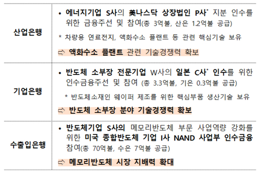 산업·기업·수출입은행은 해외 기술기업을 인수해 국내기업의 공급망 리스크를 완화한다. 기업은행은 국내 기업의 글로벌 진출 지원에 특화된 인수·합병 전문 펀드운용사 풀(Pool)을 관리하고, 산업은행은 국내기업의 인수작업이 용이하도록 시장조사·해외네트워크 연결·인수전략 설계 등을 통해 종합자문을 제공할 계획이다.