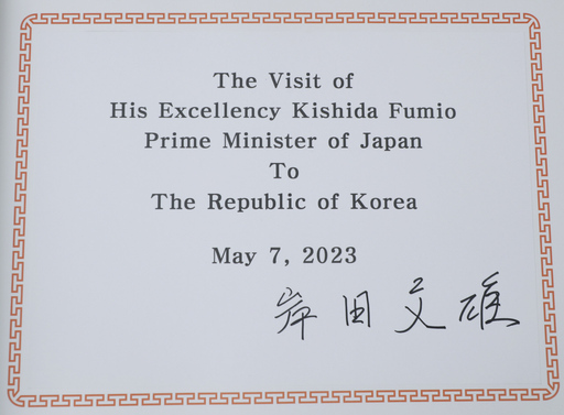 이어서 방명록 앞으로 이동해 미리 준비된 방문 문구에 '岸田文雄(안전문웅, 기시다 후미오)' 서명을 했다. 방문 문구는 'The Visit of His Excellency Kishida Fumio Prime Minister of Japan To The Republic of Korea May 7, 2023(기시다 후미오 일본 총리의 대한민국 방문-2023년 5월 7일)'이다.