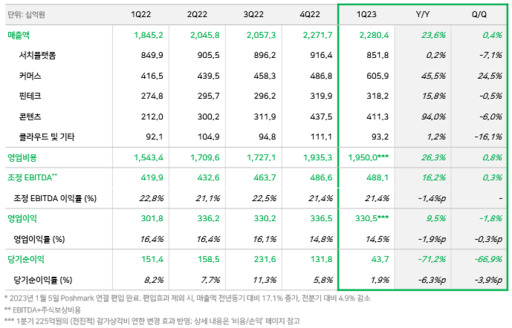 1분기 연결 매출액은 전 분기 대비 0.4% 증가했다. 조정EBITDA는 전년 동기 대비 16.2% 증가, 전분기 수준인 4881억 원을 기록했으며, 조정EBITDA 이익률은 인건비 성장 둔화 및 마케팅비 효율화, 포쉬마크의 EBITDA 흑자 달성 등으로 서치플랫폼의 계절적 매출 감소에도 불구하고 전분기 수준을 유지했다. 연결 영업이익은 서버 등 인프라 자산의 상각연수 기간을 국내 및 글로벌 추세와 실질 사용 연한에 더 부합하도록 변경한 절감 효과를 포함해 전년 동기 대비 9.5% 증가, 전분기 대비 1.8% 감소한 3305억 원을 기록했다.