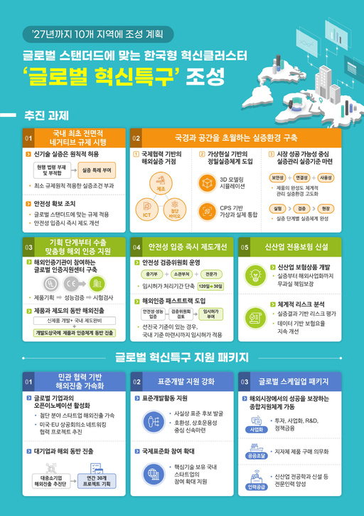 올해 2~3곳을 시범 조성하는 '글로벌 혁신 특구'는 일부 제한·금지 사항을 제외한 신기술에 대해 모든 실증이 가능하도록 네거티브 규제를 전면적으로 적용해 혁신을 전폭 지원한다.