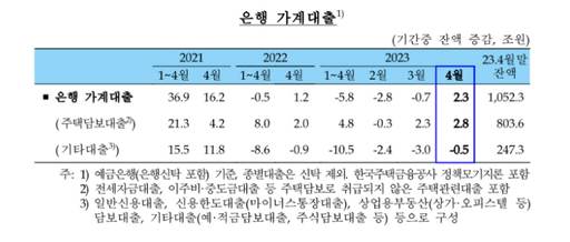 윤 차장은 "3월에 이어 4월에도 주식투자를 위해 신용대출을 활용하는 비중이 늘며 기타대출 감소폭에 영향을 준 것으로 보인다"고 말했다.
