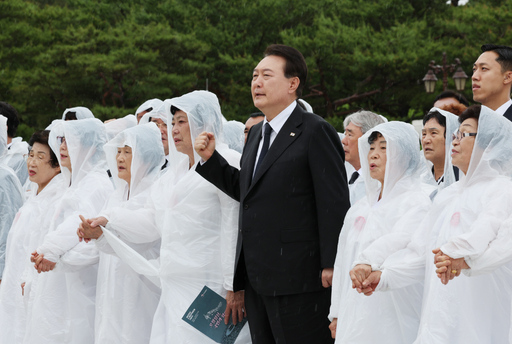 윤 대통령은 '민주의 문'에서 5·18민주화운동 당시 자식을 잃은 '오월의 어머니' 15명을 직접 맞이한 뒤 동반 입장했다. 통상 주요 인사들과 함께 입장하는 관례에 벗어난 윤 대통령은 오월의 어머니와 동반 입장해 헌화 및 분향을 함께 했다.