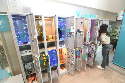 1층에는 여러 칸의 Y캠퍼스의 캐비넷이 마련돼 있는데, 아티스트들이 만든 굿즈들이 캐비넷 안에 전시돼 있다. 여기 전시된 제품의 상당수는 Y박스에서 판매되는 제품들이다. 캐비넷 위에는 영상들이 나오고 있는데, 아티스트들이 작업하는 과정을 녹화한 영상들이 보여졌다.