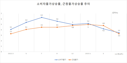이창용 한국은행 총재는 25일 통화결정방향 회의 이후 열린 기자간담회에서 "소비자물가상승률은 지난해 6~7월 국제유가가 급격히 상승한 영향으로 올해 상당 폭 낮아진 뒤 높아져 연말에는 전망치(3.5%)에 부합할 것으로 보인다"면서도 "근원물가의 경우 누적된 비용인상 압력 등으로 예상치(3.0%)를 상회하는 3.3%를 기록할 것"이라고 말했다.