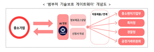 기술분쟁 단계에선 피해 중소기업의 분쟁상황에 맞는 부처별 대응, 지원사업을 신청양식 제공부터 제출까지 원스톱으로 제공하는 범부처 기술보호 게이트웨이를 LLM(AI 기반 자연어 알고리즘) 기반으로 구축한다. 이 서비스는 내년부터 제공할 예정이다.