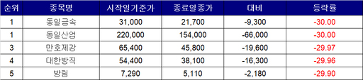 종가기준으로는 ▲동일산업은 6만6000원(-30%) 폭락한 15만4000원 ▲동일금속도 9300원(-30%) 내린 2만1700원 ▲만호제강도 1만9600원(-29.97%) 떨어진 4만5800원 ▲방림은 2180원(-29.90%) 하락한 5110원 ▲대한방직은 1만6300원(-29.96%) 내린 3만8100원에 장을 마쳤다.