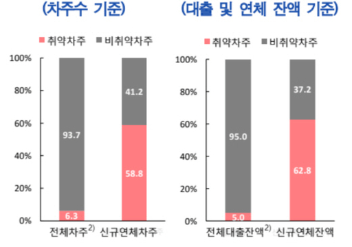 한국은행 관계자는 "최근 연체된 취약차주 중 39.5%는 연체잔액이 연간소득액을 넘어선 상태"라며 "최근 발생한 연체채권의 경우 3개월 이상 연체(고정이하여신)로 이어질 가능성이 큰 만큼 금융기관의 자산건전성에 부정적인 영향을 미칠 수 있다"고 말했다.