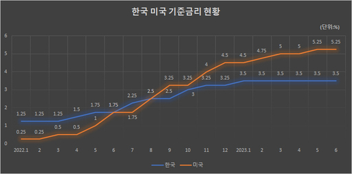 특히 한은의 금통위는 오는 7월 13일날 열려 연준 FOMC 회의(7월 25~26일)에 앞선다. 한은이 이번 7월에 금리를 동결하고 연준 FOMC에서 0.25%p 금리인상을 하면 한미 금리 역전차는 2.0%p, 이후 한은이 또 한차례(8월에) 금리동결을 단행하면 미국과의 금리 역전차는 최대 2.25%p까지 벌어질 수 있다.