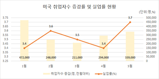 실제로 미국 노동부가 발표한 '5월 고용상황 보고서'를 보면 지난달 비농업 일자리는 33만9000개 증가했다. 증가폭은 지난 3월(21만7000개)과 4월(29만4000개)보다 늘었다. 실업률은 3.7%로 전월(3.4%)보다 높아졌지만 여전히 4%를 밑도는 낮은 수준이다. 미국 기업이 필요한 인력을 충분히 구하지 못해 임금을 올리고, 인플레이션 상승으로 이어지고 있다는 설명이다.