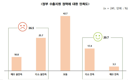 정부의 수출 지원 정책에 대해선 36.5%가 '매우 불만족'하거나 '다소 불만족'하다고 답했다. '보통'도 42.7%였다. 반면 '만족(다소 만족+매우 만족)'은 20.7%에 그쳤다.