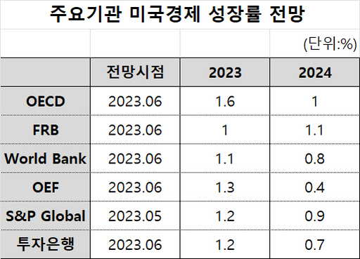 한국은행이 2일 발간한 '해외경제포커스: 2023년 하반기 미국 경제 전망 및 주요이슈'에 따르면 주요기관과 76개 투자은행이 전망한 미국경제 성장률은 1.0%~1.2%로 집계됐다.