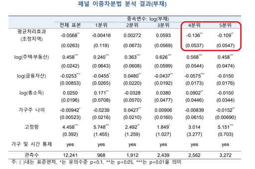 자산분위별 부채 감소 효과를 보면 자산중·하위(1~3분위)가구는 양(+)으로 나타나고, 자산상위 1~40%(4~5분기)가구는 음(-)으로 나타났다. 자산이 적은 가구에서는 강한규제가 적용되더라도 부채가 감소하는 효과가 미미했지만, 자산이 많은 가구는 규제로 대출이 뚜렷하게 감소했다는 분석이다.