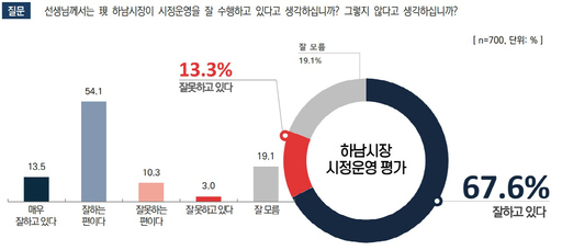 '이현재 하남시장 시정 운영 평가'에서 하남시민 67.6%가 '잘하고 있다'고 응답했고, '잘못하고 있다'(13.3%)의 5배 이상 높은 수치로, 지난해 12월 여론조사 결과(67.4%)와 비교해도 0.2%p 상승했다.