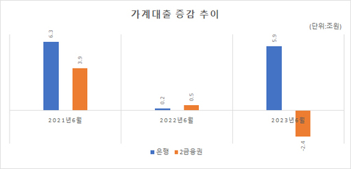 금융위원회가 이날 발표한 6월중 가계대출 동향에 따르면 지난달 가계대출은 보험사(1000억원)는 증가했지만, 상호금융(-1조8000억원)과 저축은행(-1000억원), 여전사(-7000억원)의 대출이 줄며 감소했다.
