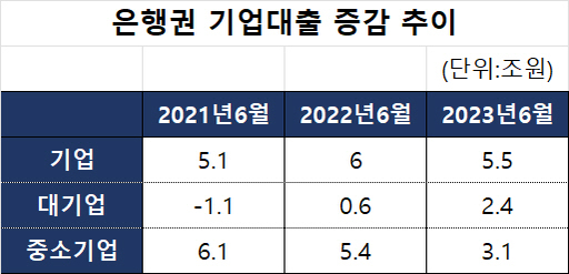 대기업 대출잔액은 233조5000억원으로 한달전과 비교해 2조4000억원 늘었고, 중소기업 대출잔액도 976조6000억원으로 같은 기간 3조1000억원 증가했다.