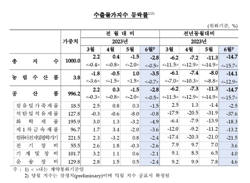 6월 수출물가지수도 113.13으로 한달 전보다 2.8% 하락했다. 역시 2개월 연속 하락세다. 전년 6월 대비 하락폭은 -14.7%로 집계됐다.