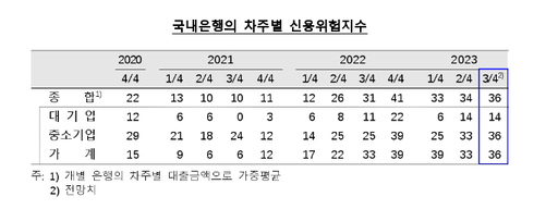 한국은행이 19일 발표한 '금융기관 대출행태 서베이' 결과에 따르면 국내은행이 예상한 3분기 신용위험지수는 36으로 2분기(34)보다 2포인트 높았다. 신용위험지수는 2021년 3분기 10에서 2022년 31로 급격히 상승한뒤 오름세를 유지했다. 신용위험지수는 0을 기준값으로 플러스면 신용위험 상승을 예상하는 응답이 더 많다는 것이고 마이너스면 그 반대를 뜻한다.