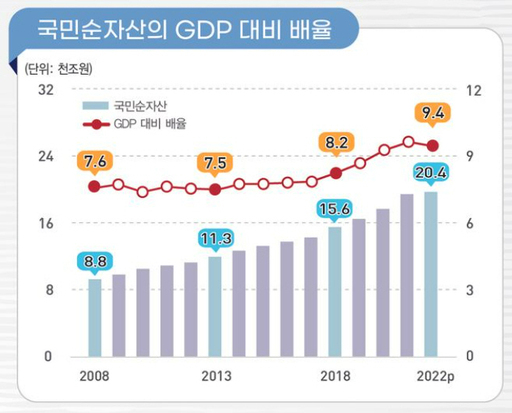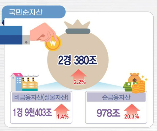 실물인 '비금융자산'과 '순금융자산'을 합한 국민순자산은 우리나라 명목 GDP(2162조원)의 9.4배에 달해, 전년(9.6배)보다 하락했다.