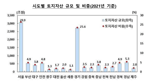 토지자산의 서울 등 수도권 쏠림 현상도 심화하는 모습이다. 2021년 토지자산의 수도권 비중은 59.3%로 ▲2017년 56.6% ▲2018년 56.9% ▲2019년 57.2% ▲2020년 58.6% 등으로 확대되고 있다. 토지자산의 수도권 증가율은 경기가 10.8%로 가장 큰 폭으로 증가하고, 이후 인천(10.4%), 서울(10.2%) 순이었다.