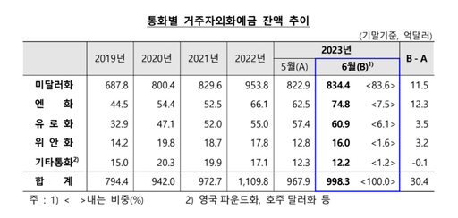 한국은행이 24일 발표한 '2023년 6월중 거주자 외화예금 동향'을 보면 지난달 말 거주자 외화예금은 전월대비 20억4000만달러 늘어난 998억3000만달러를 기록했다.