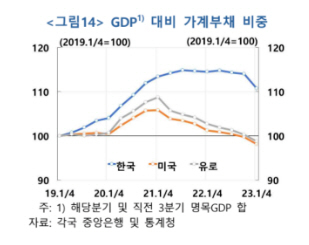 미국과 유로지역의 GDP대비 가계부채비율은 2021년 이후 낮아지고 있는 반면 우리나라는 팬데믹 기간 중 높아진 부채비중을 유지하고 있다.