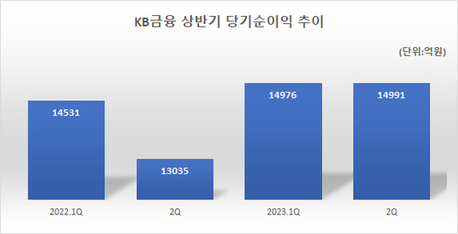 KB금융그룹은 25일 경영실적 발표를 통해 2분기 당기순이익이 1조4991억원을 달성했다고 밝혔다. 앞서 KB금융은 1분기 1조4976억원의 당기순이익을 시현했다. 상반기 총 2조9967억원의 당기순이익을 기록했다.