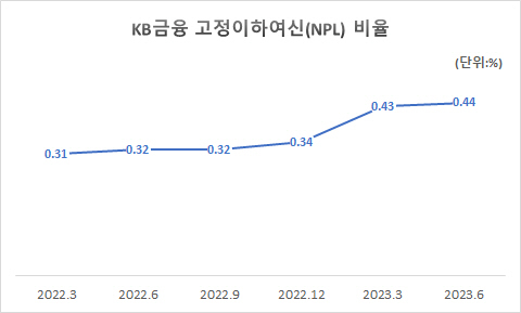 KB금융의 6월말 고정이하여신(NPL) 비율은 0.44%로 1년전(0.32%)과 비교해 0.12%포인트(p) 늘었고, 전분기(0.43%)비교해 0.01%p 증가했다.