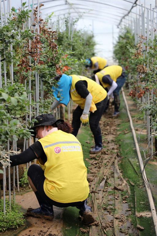 자원봉사자들은 곧바로 농장주로부터 작업 지시를 받은 뒤 침수된 비닐하우스에 들어가 복구작업을 시작했다.