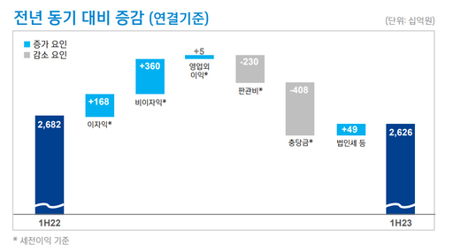 상반기 비이자이익은 2조325억원으로 전년 동기 대비 21.5% 증가했다. 수수료 이익이 줄었지만, 급격한 금리상승에 따른 유가증권 부문손실 기저효과와 시장금리 하락에 따라 유가증권 부문 손익이 개선됐다.