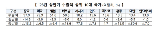 중소기업 5대 수출국 중에선 5위인 러시아를 제외한 중국(-13.2%), 미국(-6.5%), 일본(-6.4%), 베트남(-13.6%)으로의 수출이 모두 줄었다. 러시아에는 상반기에만 18억2000만 달러 어치를 수출해 77.8%나 늘었다.