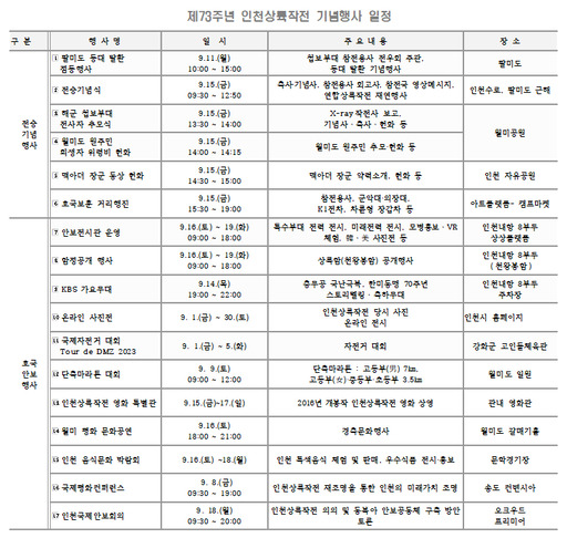 인천시는 인천상륙작전 73주년 기념행사를 오는 14일부터 19일까지 기념주간으로 설정하고 인천상륙작전 특집 'KBS 가요무대'등 인천시 전역에서 다양한 프로그램을 진행한다.