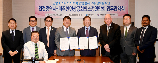 인천광역시는 유정복 인천시장이 현지 시각 10월 10일 미국 로스앤젤레스(LA)에서 미주한인상공회의소총연합회 이경철 회장과 '경제 교류 협력을 위한 업무협약'을 체결했다고 밝혔다.