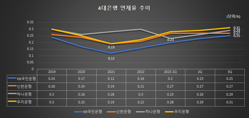 박장근 우리금융 리스크관리그룹 상무는 컨퍼런스콜에서 "고금리 상황이 지속되면서 전체적으로 (연체율이) 상승하고 있다"며 "고금리 상황이 상당기간 지속될 것으로 보여 리스크 요인을 재점검하고 부동산 PF, 관계차주 등 일부 고위험 부실이 다른부실로 전이되지 않도록 잠재부실을 관리해 나갈 계획"이라고 말했다.