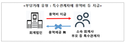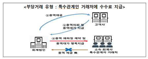B 회계사는 자신이나 특수관계자가 임원 등으로 재직 중인 거래처에 실질적인 업무수행이 없음에도 수수료를 지급했다. 해당 거래처는 배우자가 운영하는 음식점이나 동생이 가지고 있는 앱 개발회사 등으로 용역과 전혀 무관한 곳들이었다.