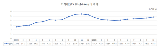 실제로 이날 금융투자협회에 다르면 10월 말 (무보증 3년·AA-) 채권금리는 4.908%로 한달 전(4.658%) 보다 0.25%포인트(p) 올랐다. 3개월 전인 7월말(4.467%)과 비교하면 0.44%p 높다.