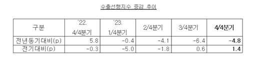 수은은 "미국 경기 호조가 지속되고, 제조업 신규 주문 지수와 수출 물가가 상승하는 등 수출 경기 회복 신호가 증가했다"며 "지난해 4분기 기저효과 영향으로 2022년 3분기 이후 5분기만에 수출 증가세로 전환될 전망"이라고 말했다.