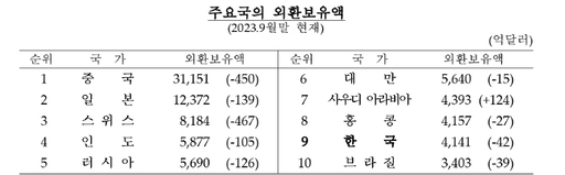 올해 9월말 기준 우리나라의 외환보유액 규모는 세계 9위로, 전월 순위를 유지했다. 1위 중국의 외환보유액은 3조1151억달러로 한달동안 450달러 감소했다. 2위 일본은 1조2372억달러, 3위 스위스는 8184억달러로 각각 139억달러, 467억달러 줄었다.