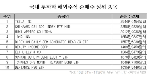 7일 한국예탁결제원에 따르면 지난주(10월 31~11월 6일)에 서학개미들은 테슬라를 2544만달러(333억원) 순매수했다. 지난달 총 순매수 금액도 1억9102만달러(2501억원)를 기록하면서 국내 투자자들의 해외주식 순매수 상위 종목 1위를 차지했다. 이와 더불어 지난주에는 디렉시온 데일리 테슬라 불 1.5배(TSLL)를 1015만달러(132억원) 사들였다.