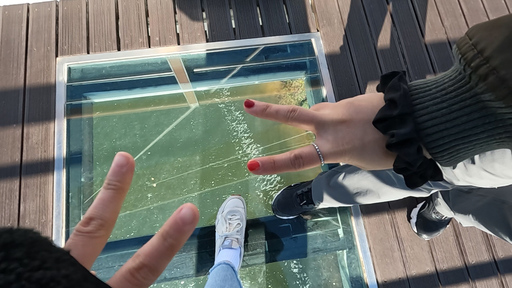 택시에서 내리자마자 파란하늘과 하늘을 담은 영주호가 보였다. 따뜻한 햇빛을 받으며 출렁다리로 향했다. 영주호를 관통하는 용천루 출렁다리는 고즈넉한 산책로의 출발점이다. 용천루 출렁다리는 용미교와 용두교 두 개로 구성되었다. 첫 번째 다리인 요미교는 아치교 형태로 길이는 약 75m이며, 다리 중간마다 바닥이 유리로 된 곳이 있어 평온히 걷다가 아찔한 경험을 했다.