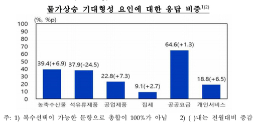 기대인플레이션율에 영향을 미친 요인으로는 공공요금이 64.6%로 가장 높았고, 농축수산물(39.4%), 석유류제품(37.9%) 순이었다.