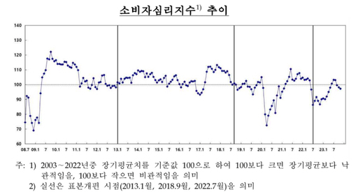 황희진 통계조사팀장은 "미국의 추가 긴축 기대감이 축소되고 수출경기 가 회복되고 있음에도 불구하고 고물가, 고금리로 인한 내수부진이 지속되면서 소비자심리지수가 하락했다"고 말했다.