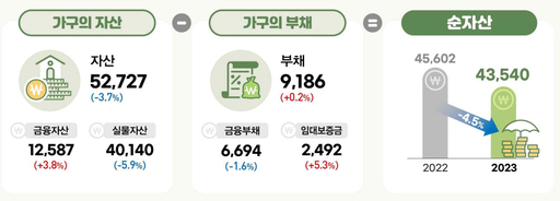 이로 인해 가구의 자산에서 부채를 뺀 평균 순자산은 4억3540만원으로 전년(4억5602만원)대비 4.5% 감소했다.