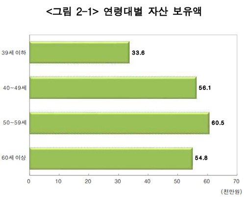 연령별로는 50대가 4억9737만원으로 가장 많았고, 60대(4억8630만원)와 40대(4억3590만원), 30대 이하(2억3678만원)가 뒤를 이었다. 순자산은 60대를 제외하고 모든 연령대에서 감소했다. 가장 많이 감소한 연령대는 30대 이하로 9.4% 줄었다.