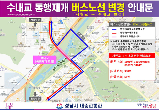 시 관계자는 "18일 수내교 통행 재개에 따라 6개 버스노선(광역버스 1101번·1101N번·8100번·9404번, 시내버스 390번, 마을버스 66번)이 정규노선으로 복귀된다"면서 "다만 해제일은 교통량 집중과 지·정체 등이 발생할 수 있어 당일에 한해 배차 간격이 다소 변동될 수 있으니, 시민들에게 양해를 구한다"고 말했다.