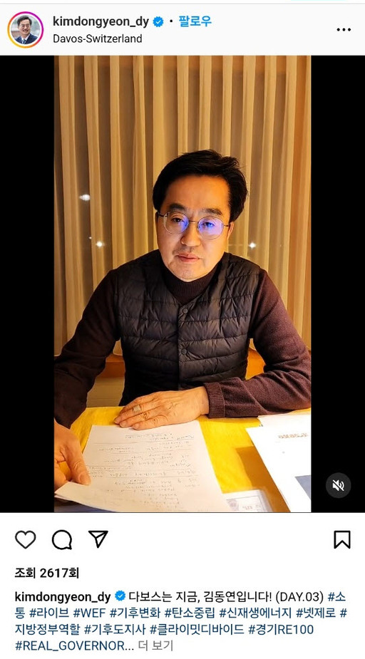 스위스 다보스에서 열리는 '2024 세계경제포럼(WEF·다보스 포럼)'에 참석 중인 김동연 경기도지사가 인한국시간 18일 오전 인스타그램 라이브를 통해 다보스포럼에서의 활동을 소개하며 국민과 소통을 이어가고 있다.