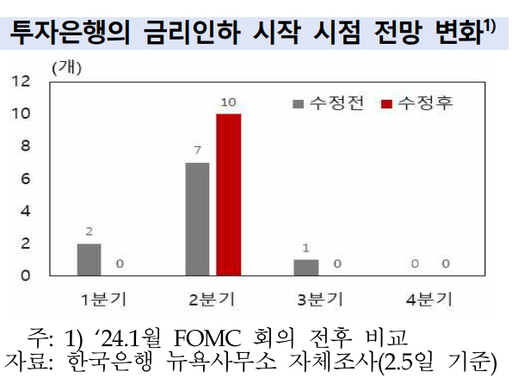 한은 뉴욕사무소가 공개한 '최근 미국경제 상황과 평가' 보고서에 따르면 글로벌 투자은행(IB) 10곳은 올 2분기 기준금리 인하가 시작될 것으로 전망했다. 인플레이션 목표(2%)가 달성됐다는 확신이 들때까지 현 수준의 기준금리(5.25~5.50%)를 유지할 수 있다는 것이다.