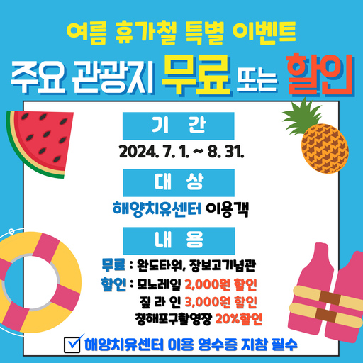 또한 완도해양치유센터가 자리한 신지 명사십리 해수욕장 개장을 맞아 7월 1일부터 8월 31일까지 주요 관광지 무료·할인 이벤트도 마련했다.