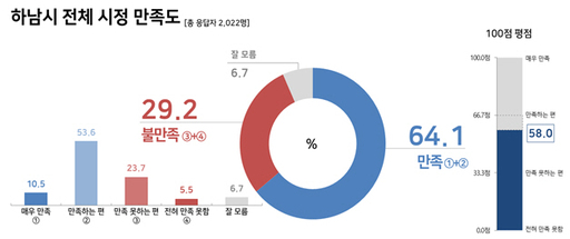 아울러 '하남시 전체 시정 만족도' 평가에서는 시민 64.1%가 "만족한다"라고 답해 시정 운영평가와 마찬가지로 긍정 비율이 월등히 높게 나타났다.