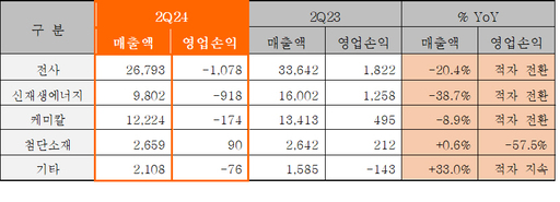 한화솔루션은 2024년 2분기 연결 기준 매출 2조6793억원, 영업손실 1078억원을 각각 기록했다고 25일 밝혔다.