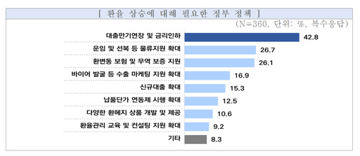 환율 상승 대응을 위해 필요한 정부 지원책으로는 '대출만기연장 및 금리인하'가 42.8%로 가장 높게 나타났다. ▲운임 및 선복 등 물류지원 확대(26.7%) ▲환변동 보험 및 무역 보증 지원(26.1%) 등이 그 뒤를 이었다.